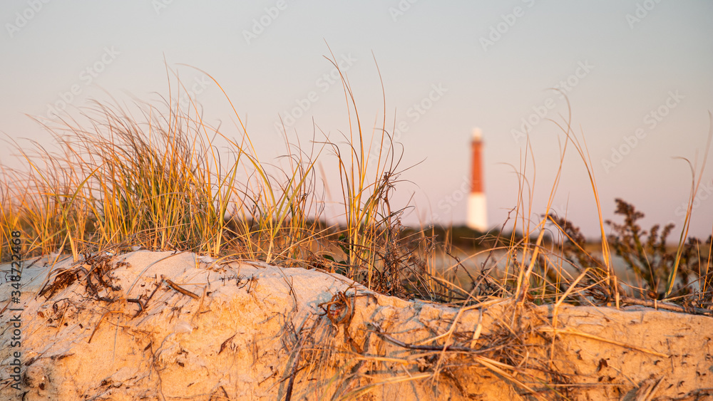 Unusual shot of a blurred Barnegat Lighthouse with sharp dune vegetation in the foreground