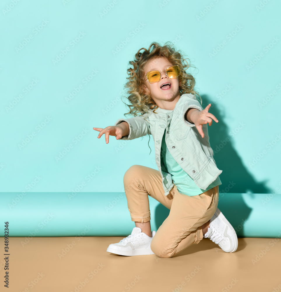 Nice little girl with curly hair in stylish glasses with orange lens laughing delightly stretching hands out. Close up portrait isolated on turquoise