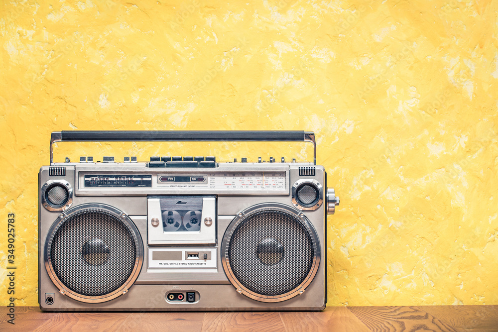Retro outdated portable stereo boombox radio receiver with cassette recorder from circa 80s front concrete textured yellow wall background. Listening music concept. Vintage old style filtered photo