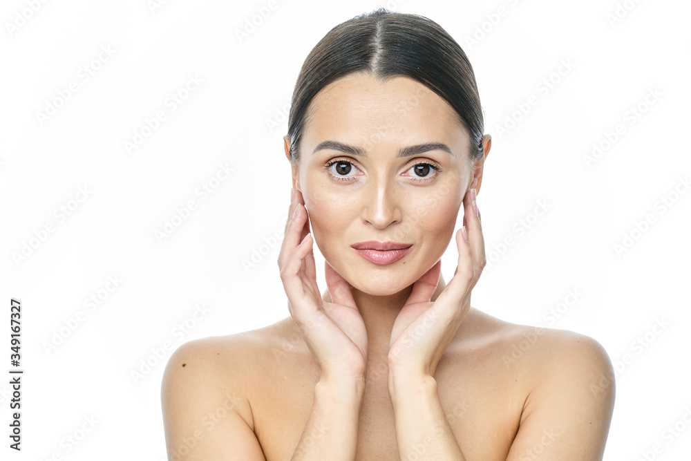 Beautiful smiling woman with clean skin, natural make-up, and white teeth on white background