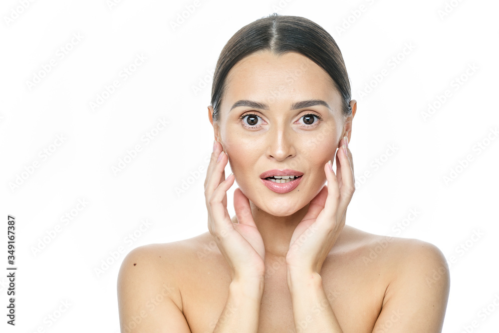 Beautiful smiling woman with clean skin, natural make-up, and white teeth on white background