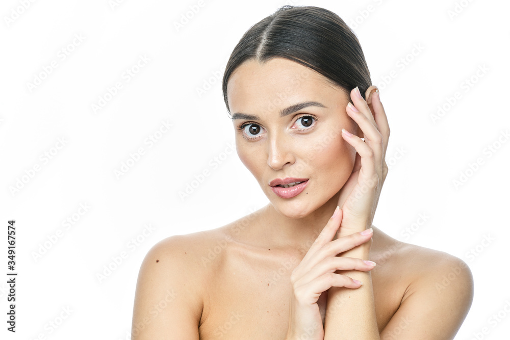 Beautiful smiling woman with clean skin, natural make-up, and white teeth on white background