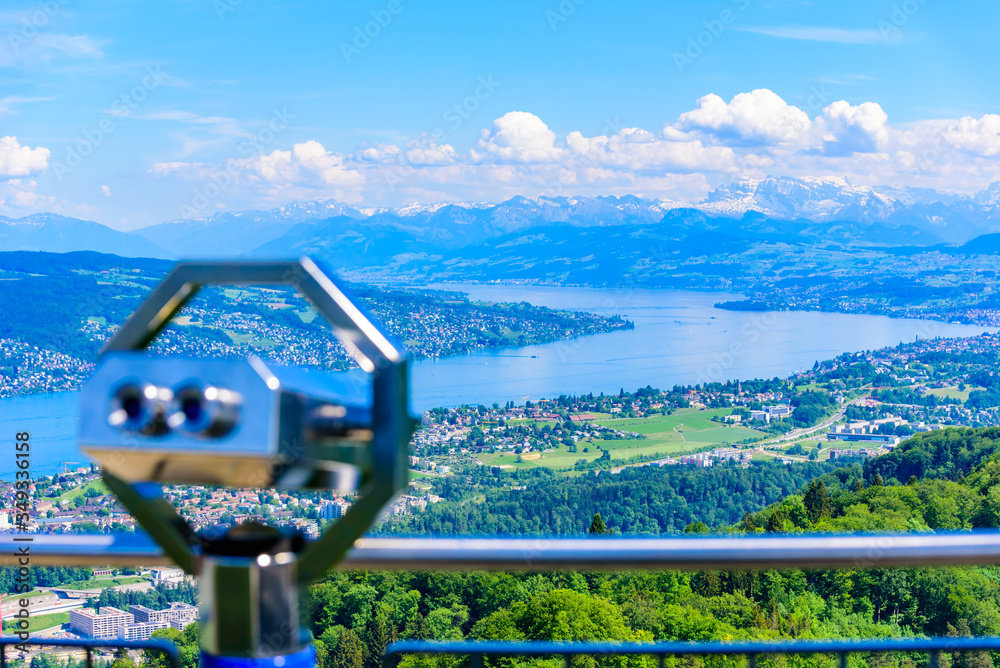 Panoramic view of Zurich lake and Alps from the top of Uetliberg mountain, from the observation platform on tower on Mt. Uetliberg, Switzerland, Europe