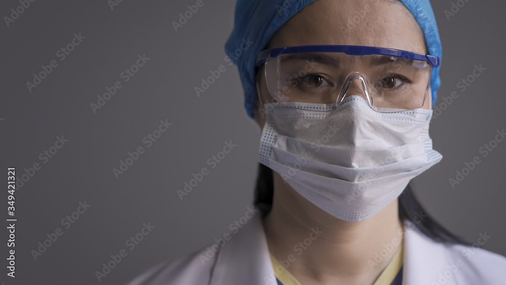 Worried female doctor looking at camera wearing protective medical uniform, mask, cap and glasses. Asian nurse feeling stress during pandemic. Close up portrait on grey background. Copy space