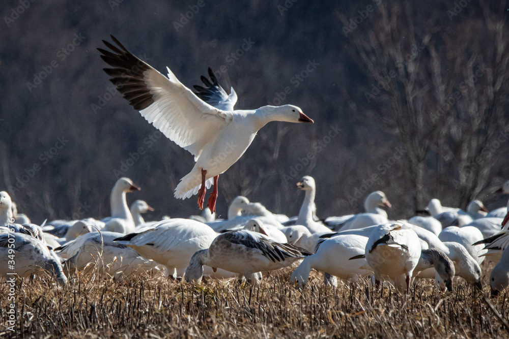 A snow goose comes in for a landing among a flock of its peers feeding in a field