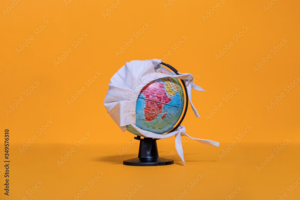 Weltkugel mit weißer Maske mit Blick auf Afrika auf orangenfarbenem Hintergrund