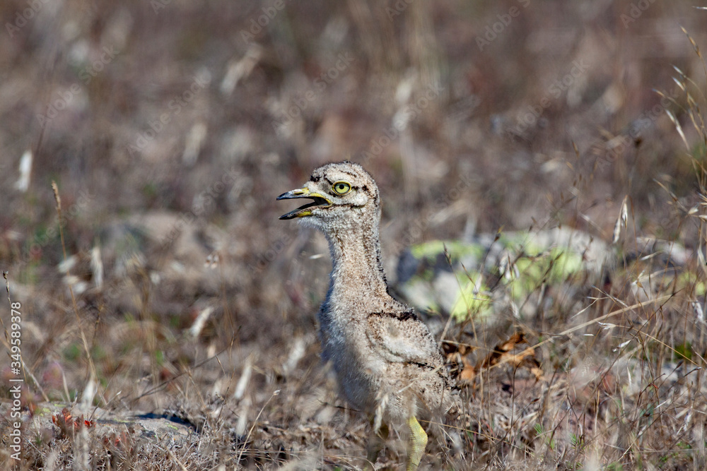 Eurasian stone curlew young (Burhinus oedicnemus) walks on a beautiful background.