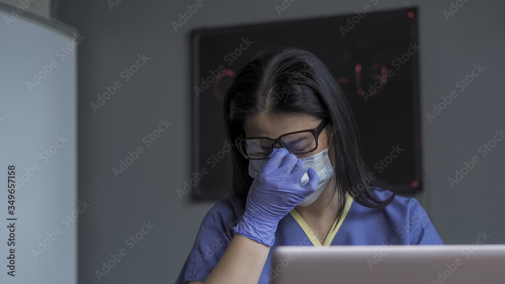 Exhausted doctor working with laptop computer. Tired woman rubs the nose to relieve tension from overtime work. Female medic resting from excessive workload. Overworking concept