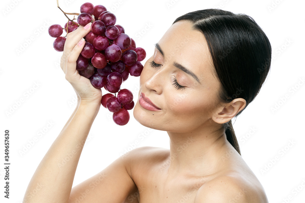 close-up portrait of a girl with clear skin and big brown eyes with soft makeup, with red grapes on a white background