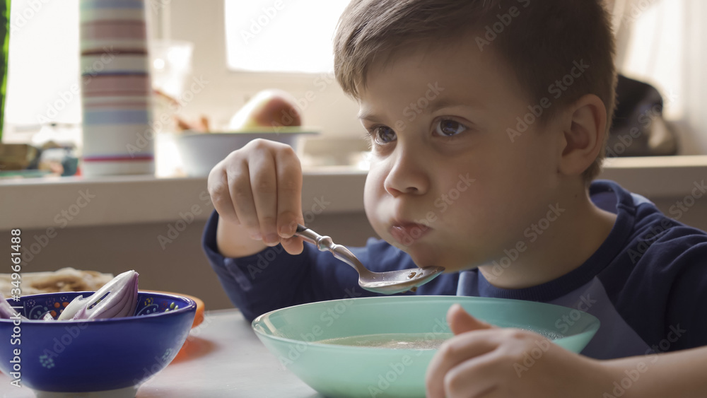 Hungry preschool child eating soup from a bowl. A serious boy scored a mouthful of soup sitting with big cheeks. Good appetite concept