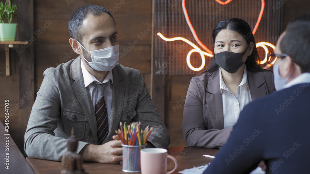 Business team meeting in office. Friendly colleagues communicate while sitting at office desk, wearing formalwear and protective face masks due to outbreak of the covid-19 virus. Pandemic concept