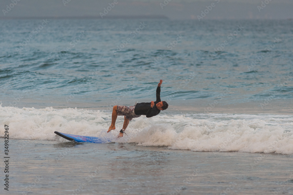 Beginner surfer learns to row and ride on a training board in small waves in the ocean.
