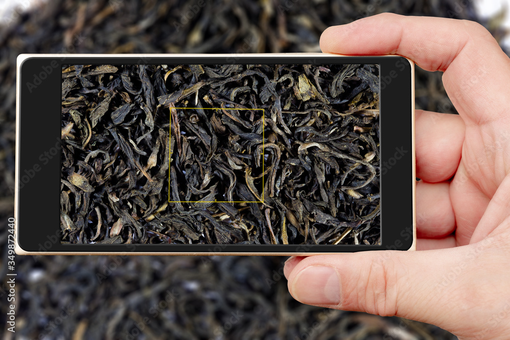 Black tea on smartphone screen. Black tea for making refreshing drink. Textures of black tea.