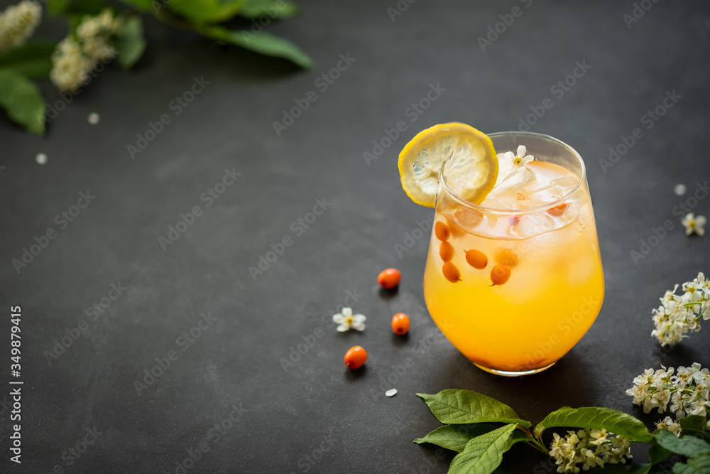 Fresh cocktail with sea buckthorn, juice, and ice in glass on dark background. with copy space Summer drinks and cocktails