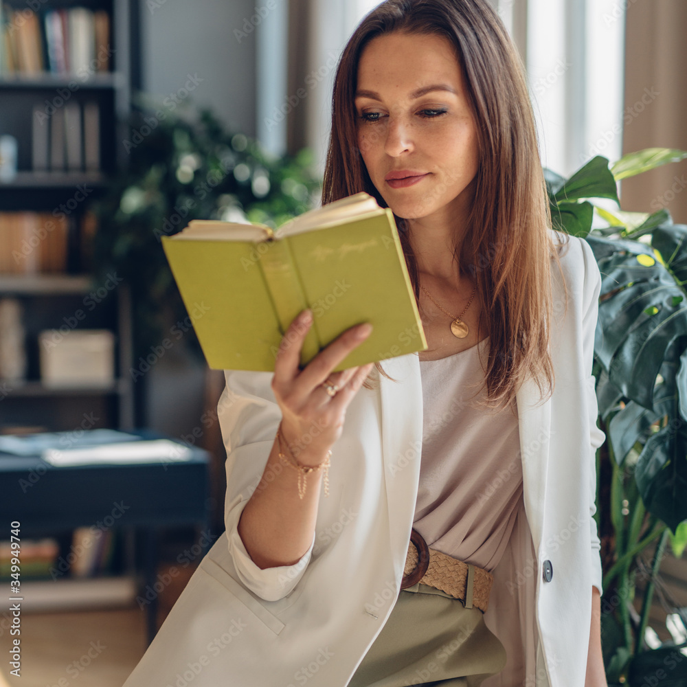 Portrait of young woman reading book at home