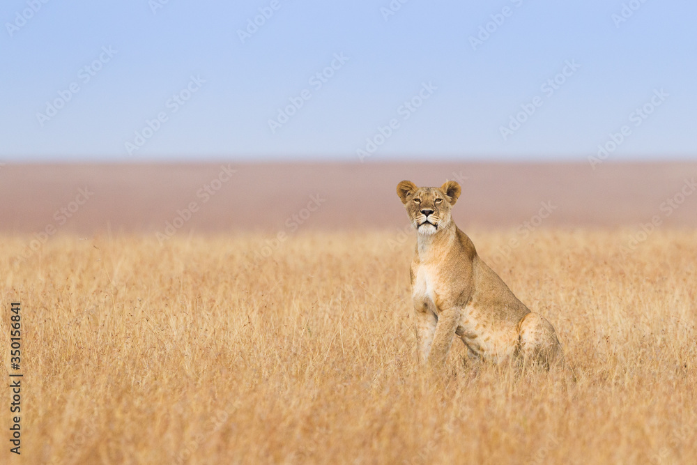Single Lioness in the open grassland of the Masai Mara Kenya