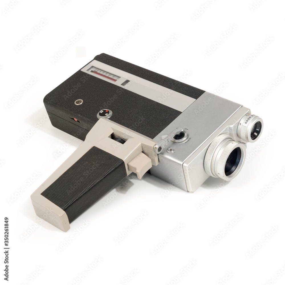 Vintage historic analog handheld filmmaker camera for super-8 films with viewfinder and handle grip. Full shot on white background with object shadow for cut out, no people.