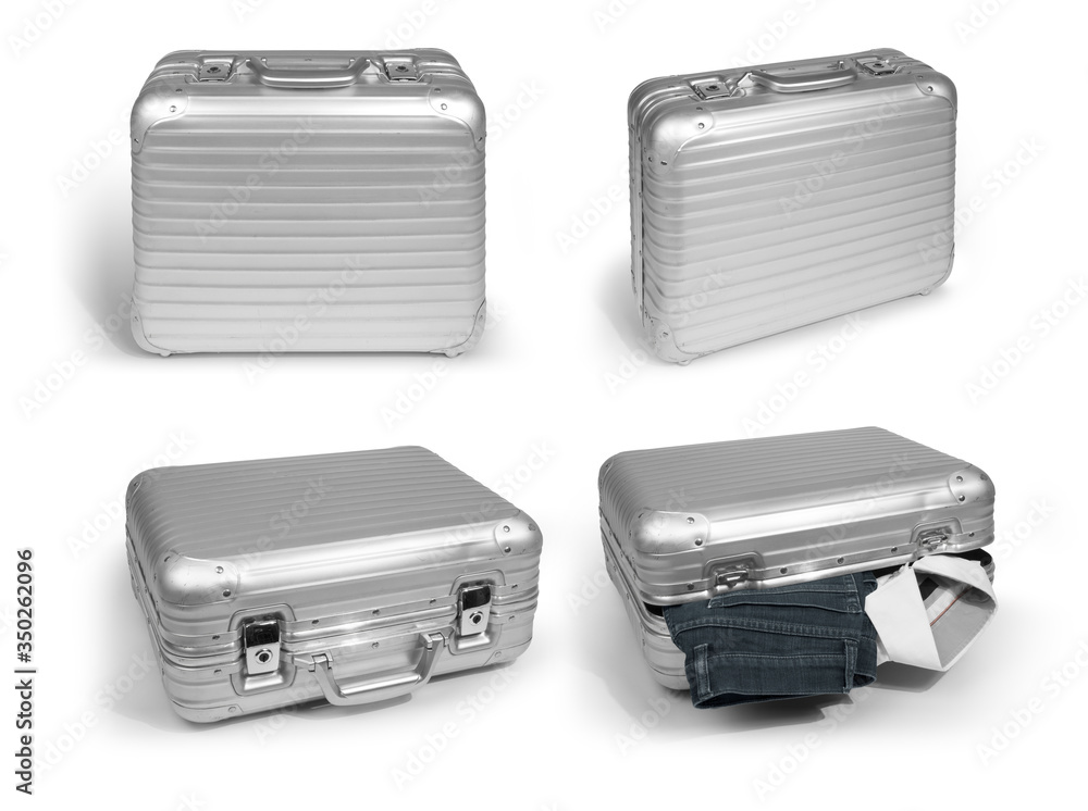 Vintage silver aluminum hard shell case with grooved structure in 4 perspectives. Full shot in 4 perspectives on white background with object shadow, isolated for cut out, no people.