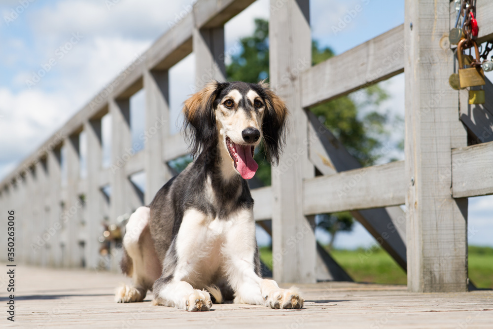 Saluki dog portrait outside. happy dog in nature