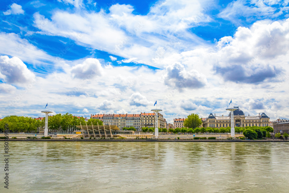 Shore of the Rhone river in center of Lyon city, Auvergne-Rhone-Alpes region, France
