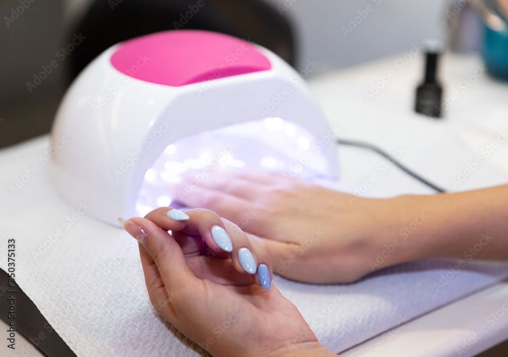 Close-up beautiful woman hands and lamp for nails on table. Nail gel salon. UV lamp. Process of drying gel on nails. Beauty and self care. Modern technology in nail salon. Nail care after quarantine