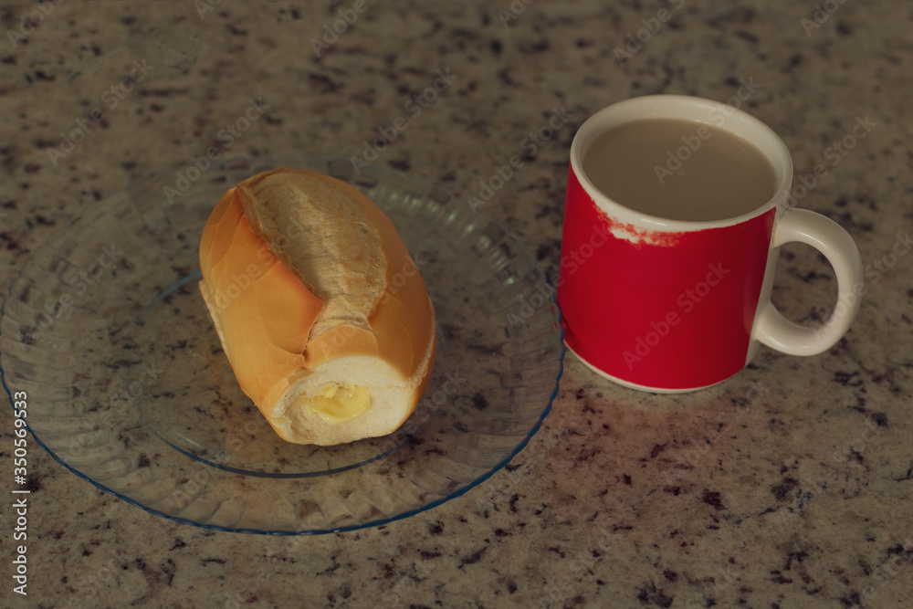 Brazilian breakfast. Cup of coffee and toasted bread with butter in the kitchen