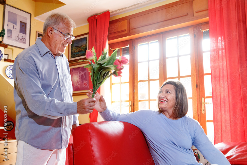 Anziano signore porge dei fiori a sua moglie seduta nel divano in salotto