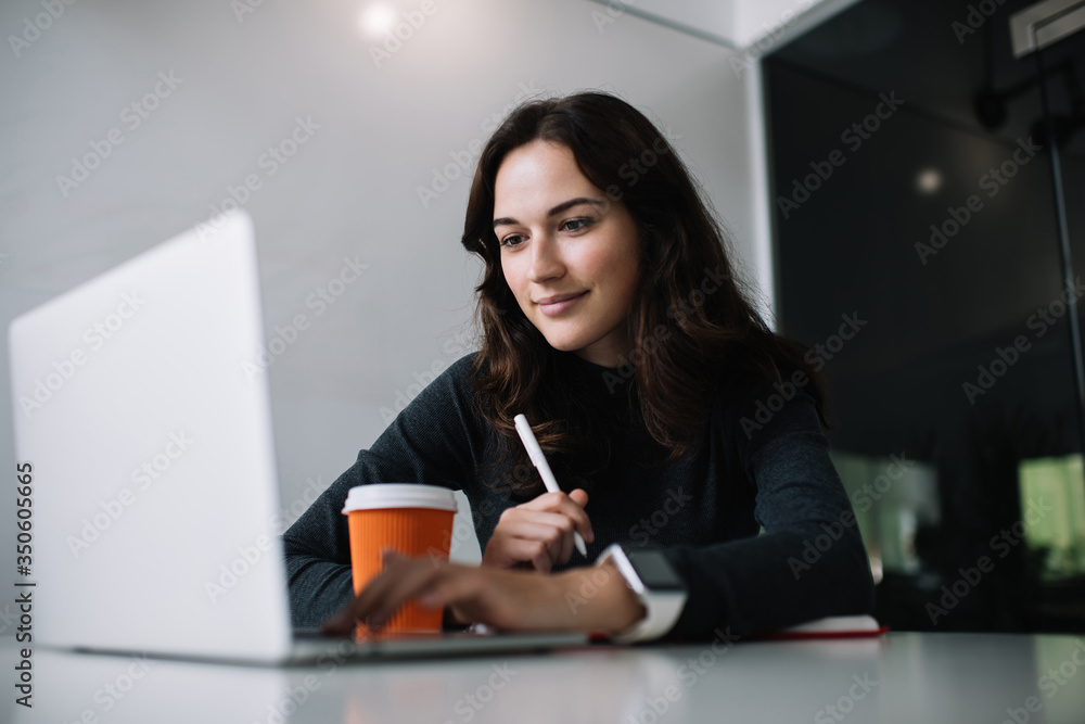 Young caucasian brunette woman using laptop computer for researching information for startup business, skilled female freelancer using app on netbook and 4G working remotely in coworking space