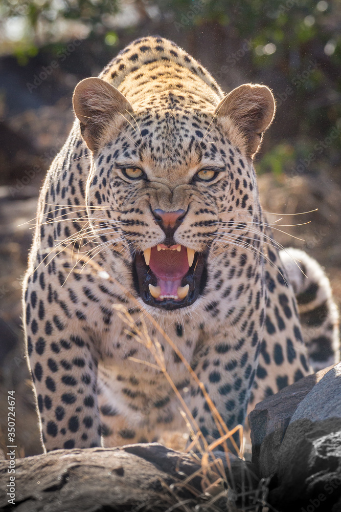 One aggressive male Leopard bearing teeth Kruger South Africa