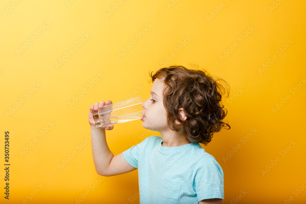 Cute 5 years old curly kid boy drinking clean water from glass at yellow background. clean drinking water concept