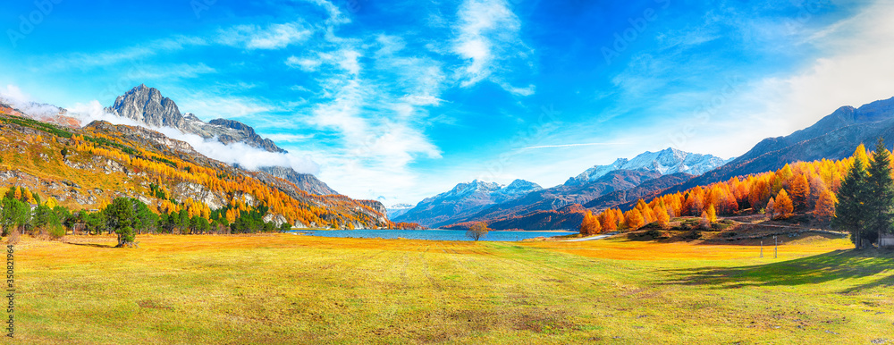 Charming autumn scene in Swiss Alps and views of Sils Lake (Silsersee).