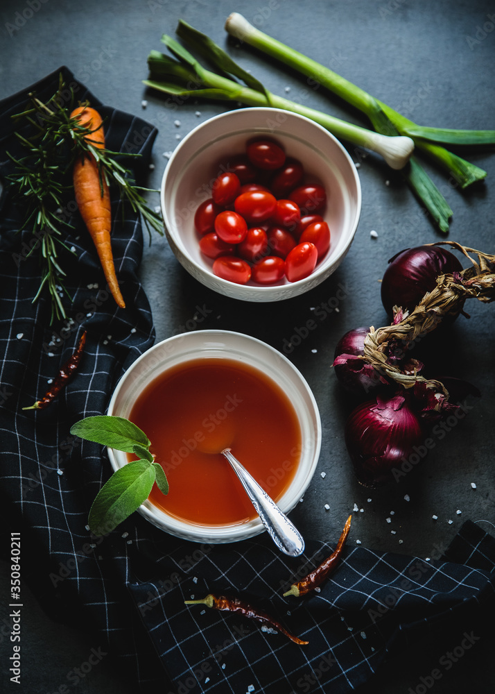 Brodo vegetale vista frontale con pomodori sedano e cipolle
