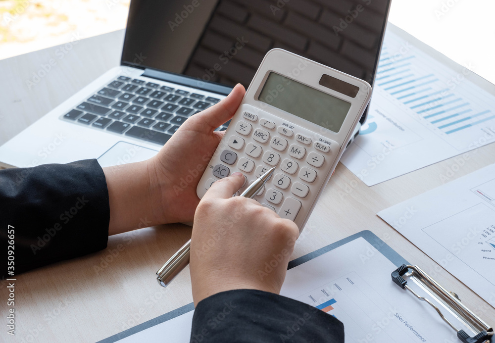 A businesswoman or an accountant in a black suit uses a calculator to calculate prices. And customer proposals for future financial spending for balance and prosperity, using graphs to analyze