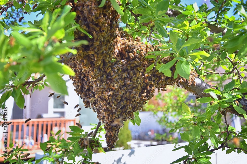 Swarm of Honey Bees, a eusocial flying insect within the genus Apis mellifera of the bee clade. Swarming Carniolan Italian honeybee on a plum tree branch in early spring in Utah. Formation of a new co