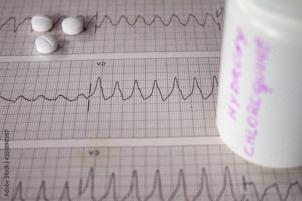 Adverse effects on the heart by hydroxychloroquine or chloroquine. Pills on an electrocardiogram with cardiac arrhythmias. White container with "hydroxychloroquine" written on the side.