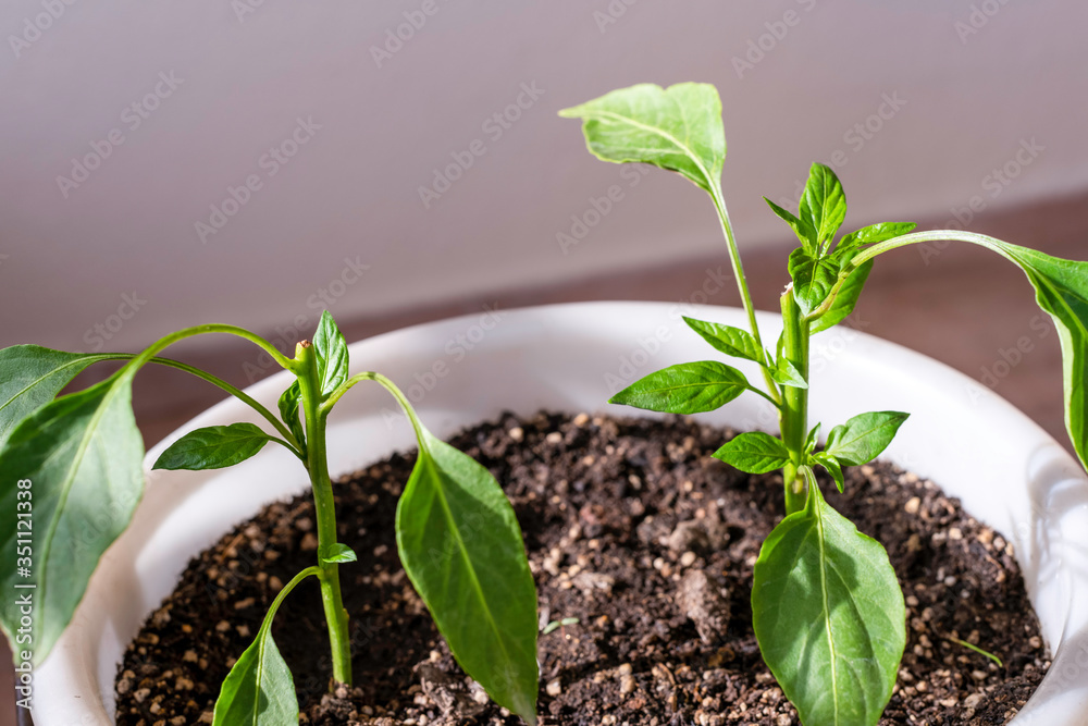 Pruned pepper plants, potted in a plastic bucket at house balcony. Home gardening. Close-up shot.