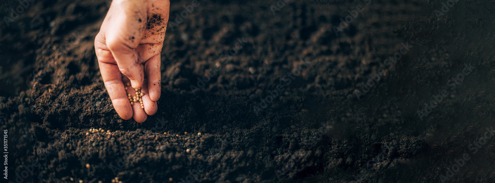 Hand growing seeds on sowing soil. Background with copy space. Agriculture, organic gardening, planting or ecology concept. Sustainable business investment. Gospel spreading