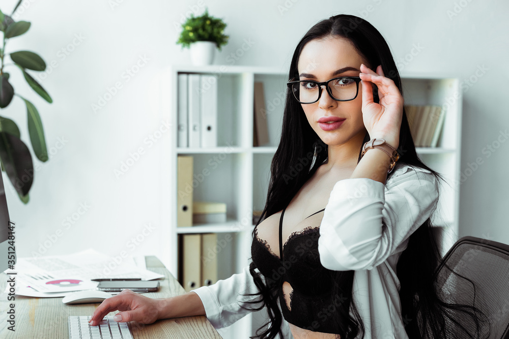 Sensual secretary in bra and eyeglasses looking at camera and using computer in office