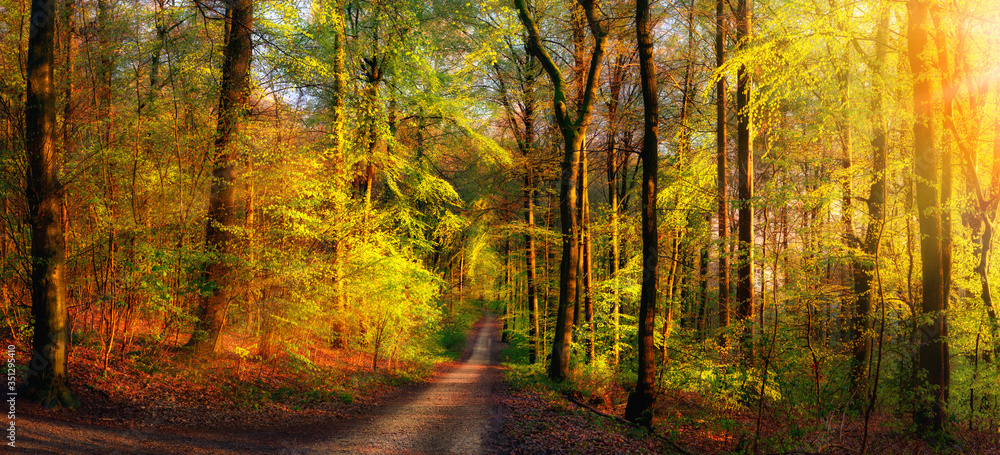 Gold forest scenery with rays of warm light illumining the foliage and a footpath leading into the scene