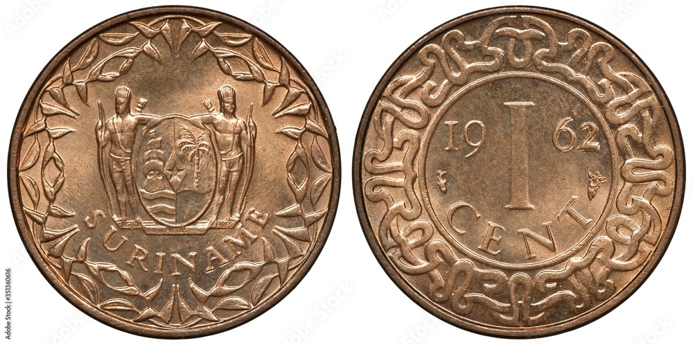 Suriname Surinamese coin 1 one cent 1962, shield with supporters within floral wreath, denomination, date and mint marks within central circle,