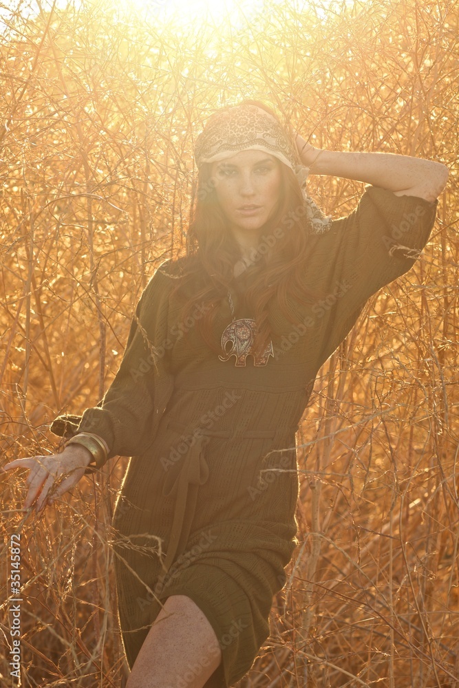 Redhead Model Amongst Wheat Fields in the Warm Sun. Intentionall