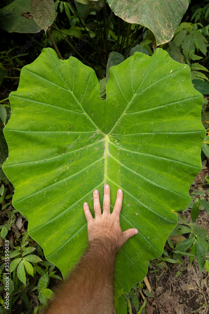 Comparing my hand on a huge heart-shaped leaf of the Colocasia esculenta species, it grows on the way to the famous Sewu Falls.
