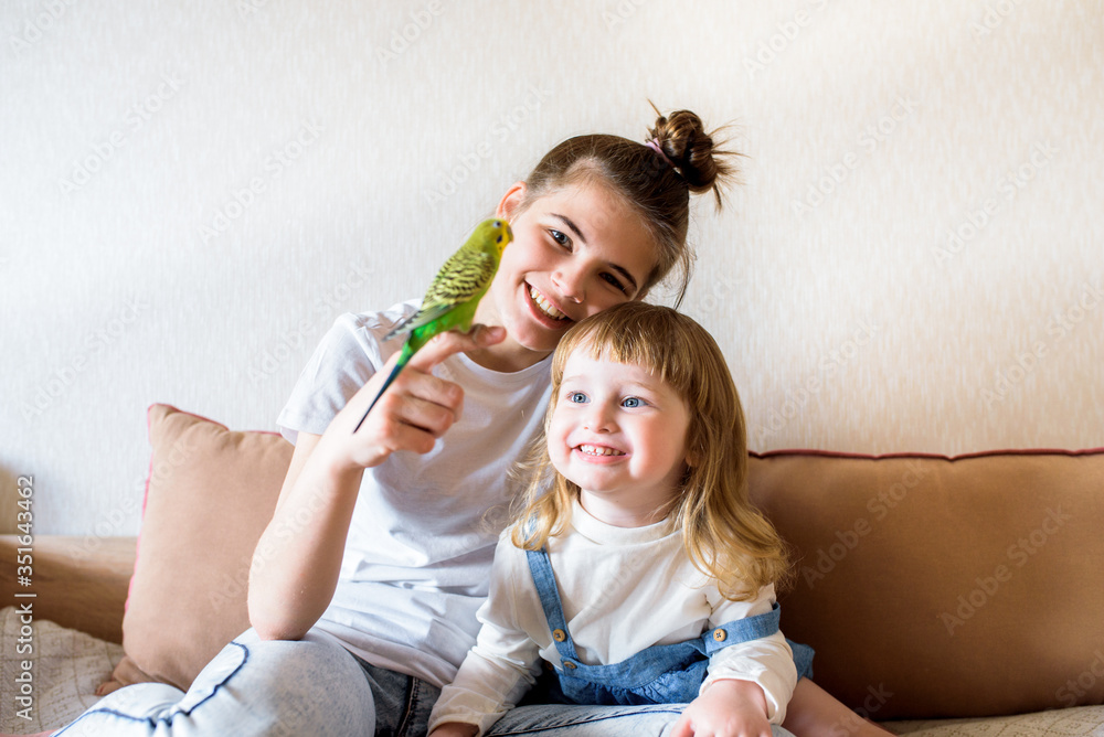 Happy children play with a parrot at the computertwo girls at home talking with a parrot. Pet. Budgerigar. online consultation of the vet
