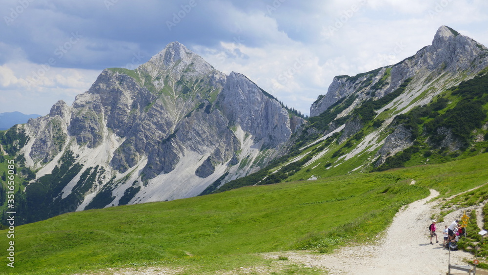Tannheimer Tal, Große Schlicke mit Wanderweg und kleiner Wandergruppe