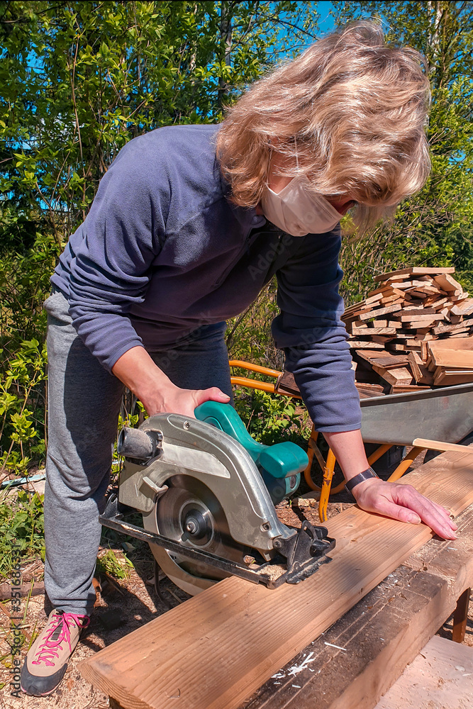 masked woman using a circular saw cuts a wooden board on the street in the early summer morning.