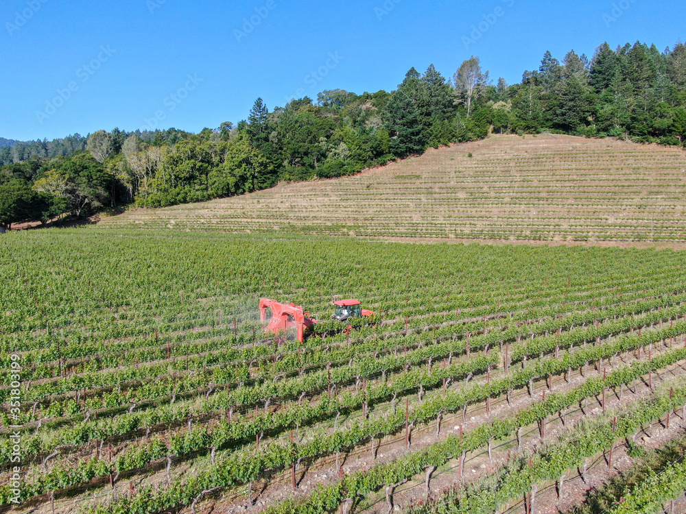 Farm tractor spraying pesticides and insecticides herbicides over green vineyard field. Napa Valley, Napa County, California, USA. April 5th, 2020