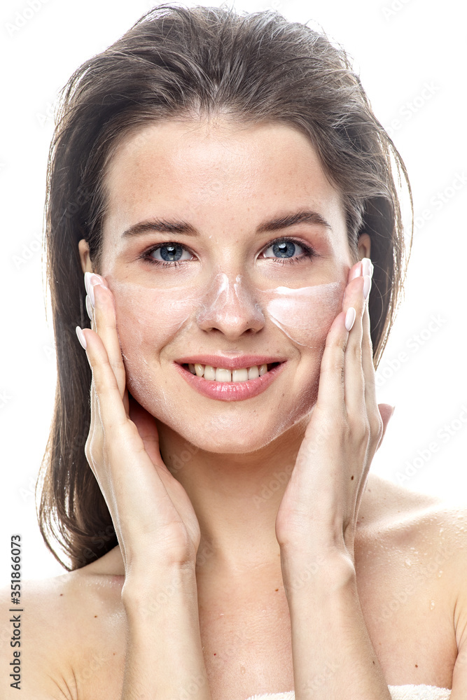 girl with clean skin apply cream on her face. Isolated on a white background