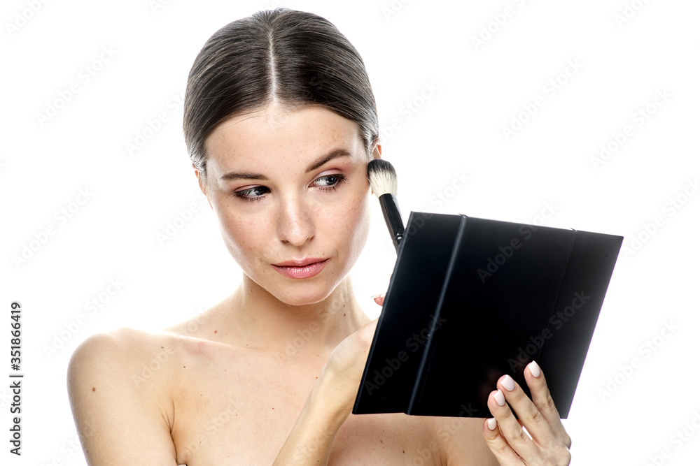 a girl with a clean face applies a tone to her face with a makeup brush and looks in the mirror