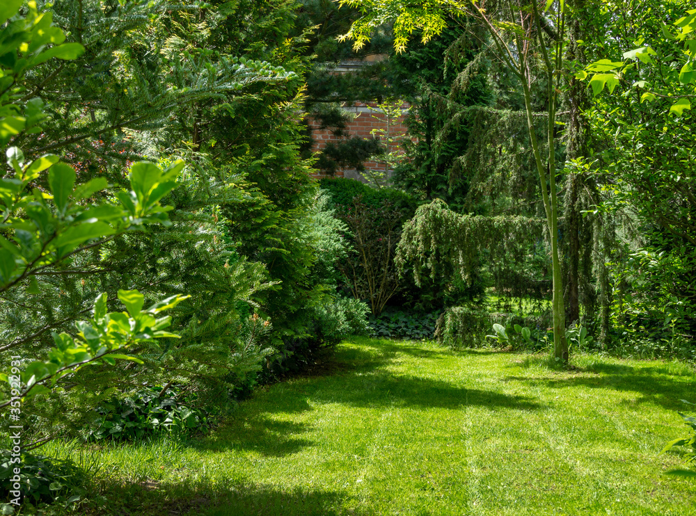 Beautiful landscaped garden with evergreens and green lawn with fresh grass. Sunny and peaceful atmosphere of relaxation. Nature concept for design. Spring landscape, fresh wallpaper