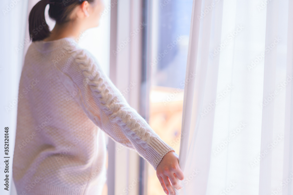 朝 採光 換気 カーテン 開ける 女性 若い 子供 日本人 人物 さわやか 朝日 窓 春